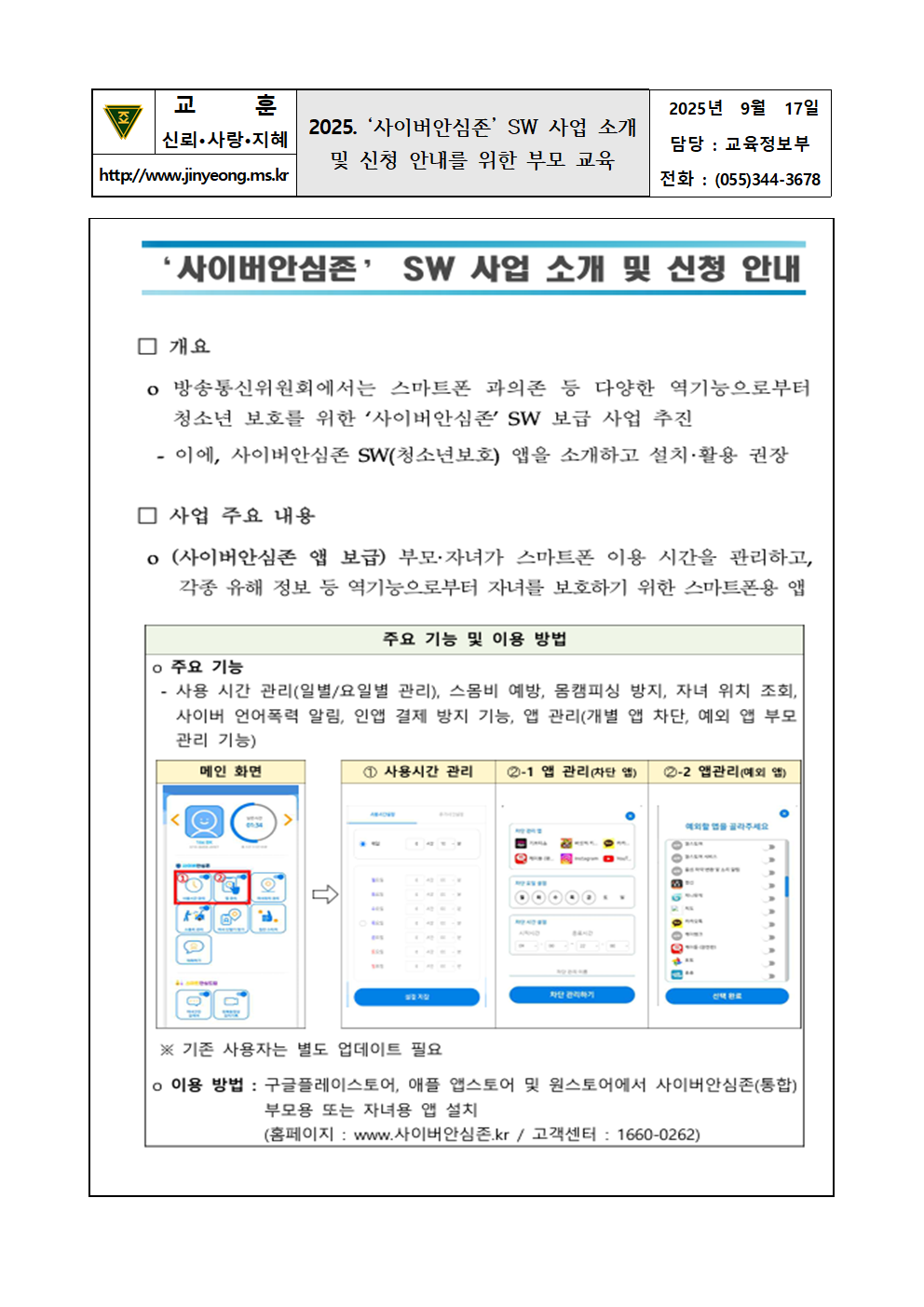 2025. '사이버안심존' SW 사업 소개 및 신청 안내를 위한 부모 교육